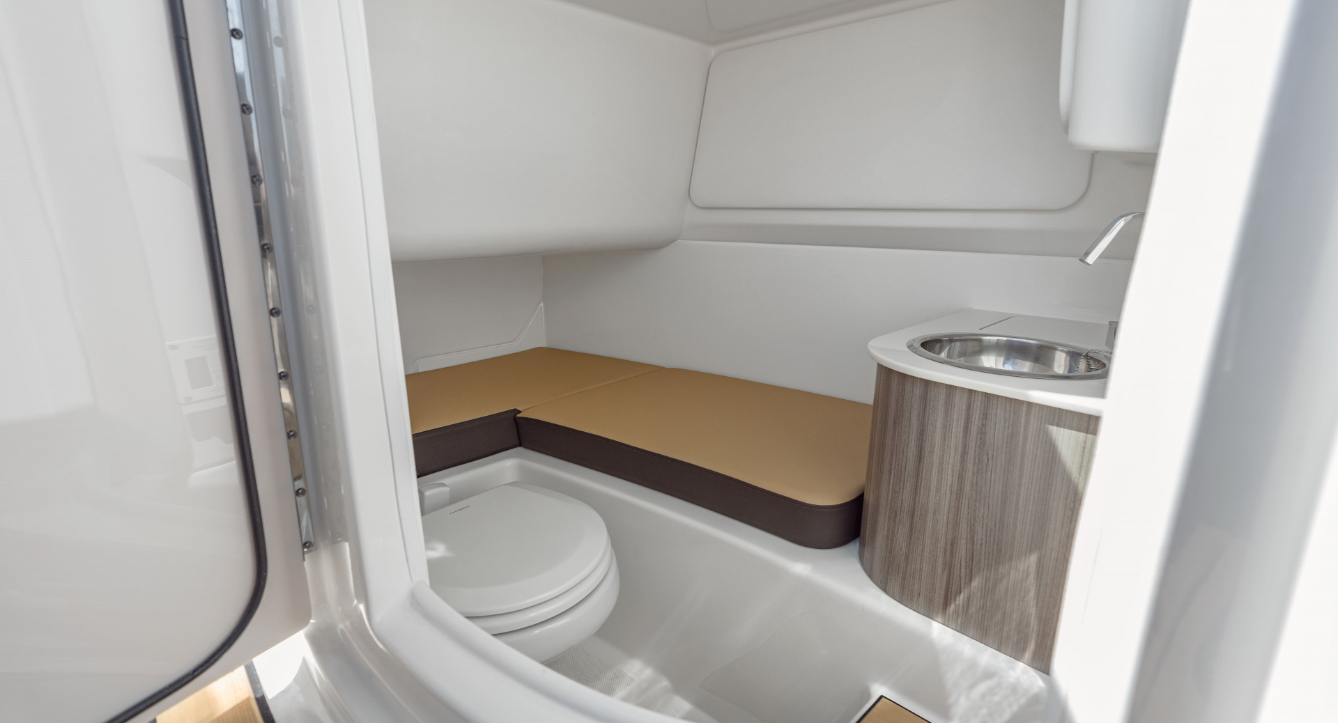 | Носовой трап (доступен только при отсутствии якорной лебедки) Встроенная душевая лейка в носовой части катера Гальюн: унитаз с электросмывом, масератором, сливным баком | |||||